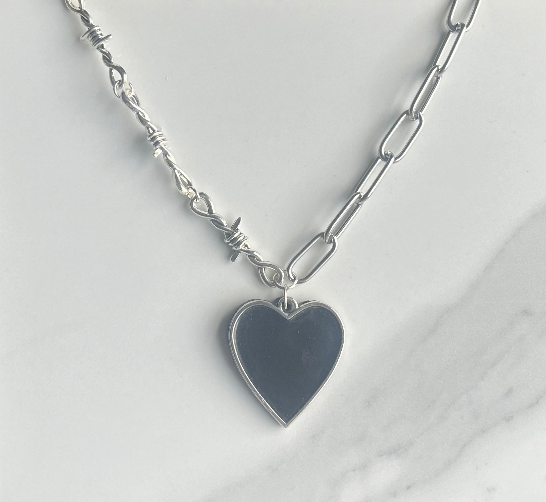 Necklace is a paperclip style, stainless steel. 18” handmade chain with a 2 inch extender. Each barbed wire is attached