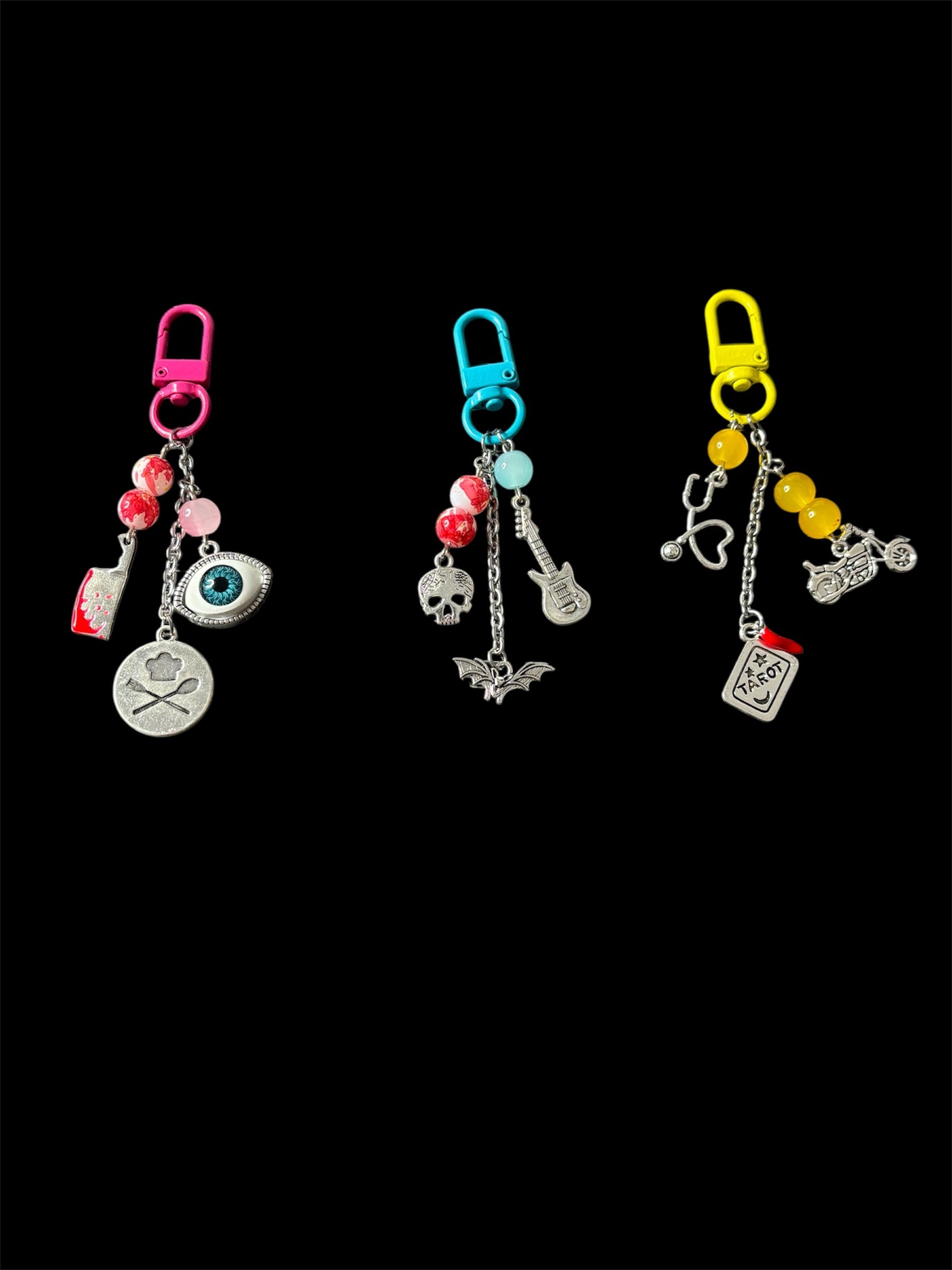 Junk inspired keychains. Please note the colour of the keychain might be a different shade of pink, blue or yellow that you see in this photo.
